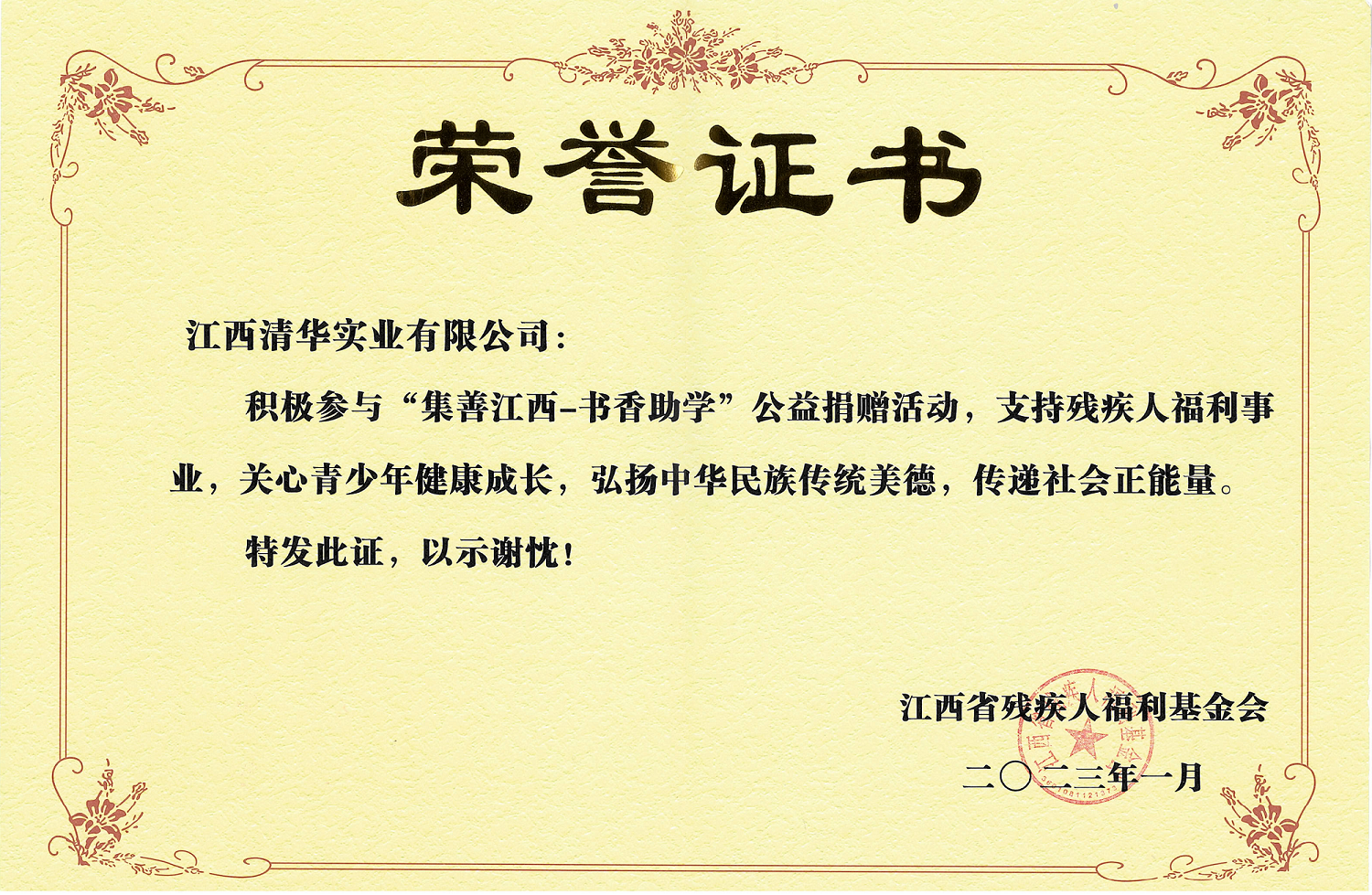 近日,江西清华实业有限公司收到了一份来自江西省残疾人福利基金会发来的荣誉证书,对公司参与“集善江西——书香助学”公益活动捐赠100套(每套10本)爱心图书表示嘉奖与感谢。