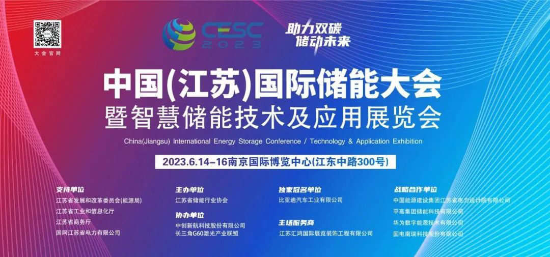 2023年6月14日,由江苏省发改委、江苏省工信厅、江苏省商务厅、国网江苏省电力有限公司联合支持,江苏省储能行业协会主办的CESC2023中国(江苏)国际储能大会暨智慧储能技术及应用展览会在南京国际博览中心顺利召开。