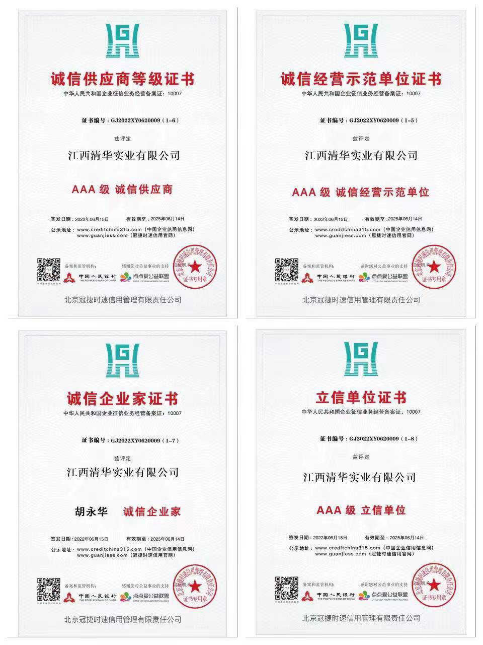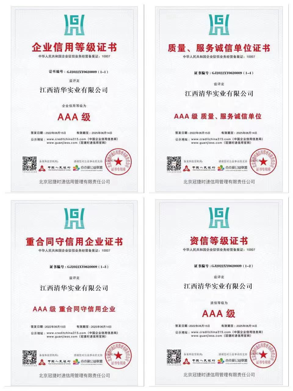 近日,江西清华实业有限公司经申报、评价机构测评、公示、备案等诸多程序,顺利通过审核,荣获了多项AAA级企业信用等级评价证书。