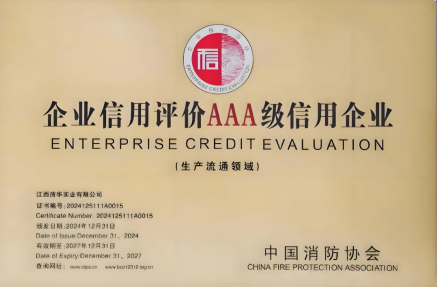 在诚信经营的道路上,江西清华实业一路高歌猛进,佳绩频传!近日,我公司收到了中国消防协会颁发的AAA级企业信用等级证书。