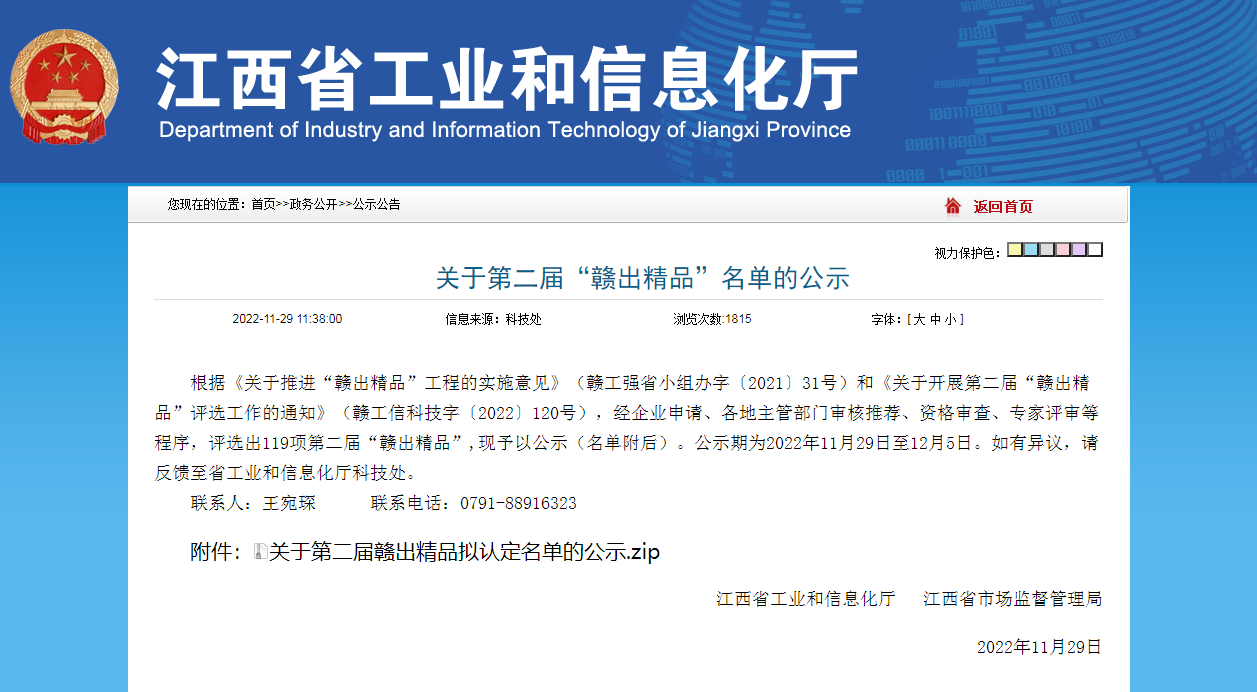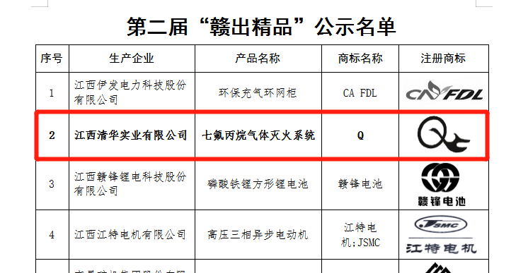 近日,江西省工业和信息化厅、江西省市场监督管理局联合发布了第二届“赣出精品”名单,江西清华实业有限公司携七氟丙烷气体灭火系统强势上榜!!!