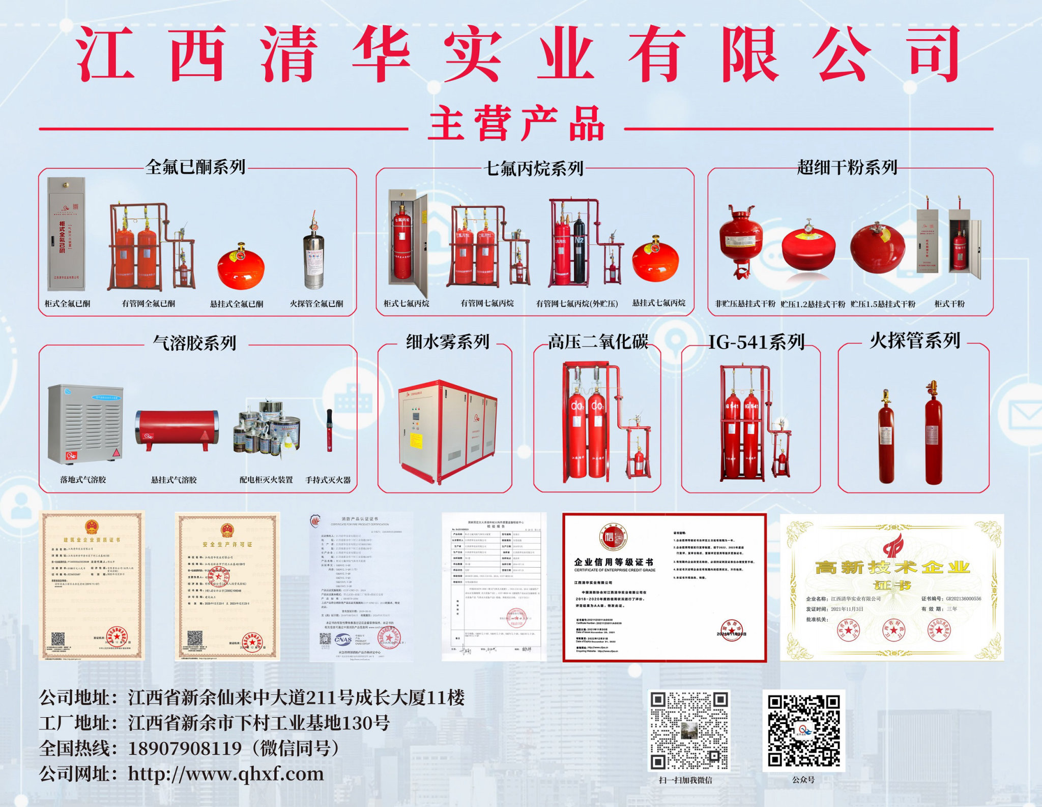 江西清华实业有限公司是专注消防气体自动灭火领域30年的老品牌,公司现有10多个产品系列,近300个产品型号,包括气溶胶、七氟丙烷、IG-541、高压二氧化碳、高压细水雾、火探管、超细干粉、全氟己酮等多个系列消防产品。