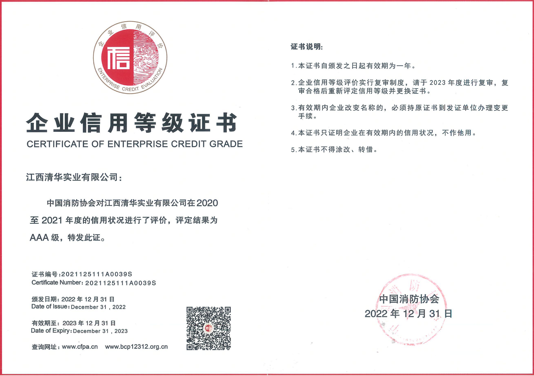 近日,江西清华实业有限公司喜获新荣誉,收到了中国消防协会颁发的AAA级企业信用等级证书。
