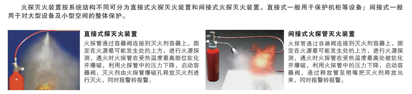 探火管式感温自启动灭火装置是一套简单、低成本且高度可靠的独立自动灭火装置,它无需任何电源,无需专门的火灾探测器,无需复杂的设备及管线,利用自身储压,依靠一根经充压的探火管及一套火探瓶组就能快速、准确、有效地探测及扑灭火源,集火灾探测和灭火于一体,将火患扑灭在最初阶段。既可大幅度降低工程的造价,也可降低灭火剂的使用量,减少对环境的污染,并且不会对人员造成任何伤害。作为一种新型探火灭火装置,解决了困扰消防行业已久的对电器设备、控制箱、配电板等易发生火患的空间的防火问题。在国内已广泛应用于电厂、通讯、广电、石化、铁路、储油库、计算机房等场所。